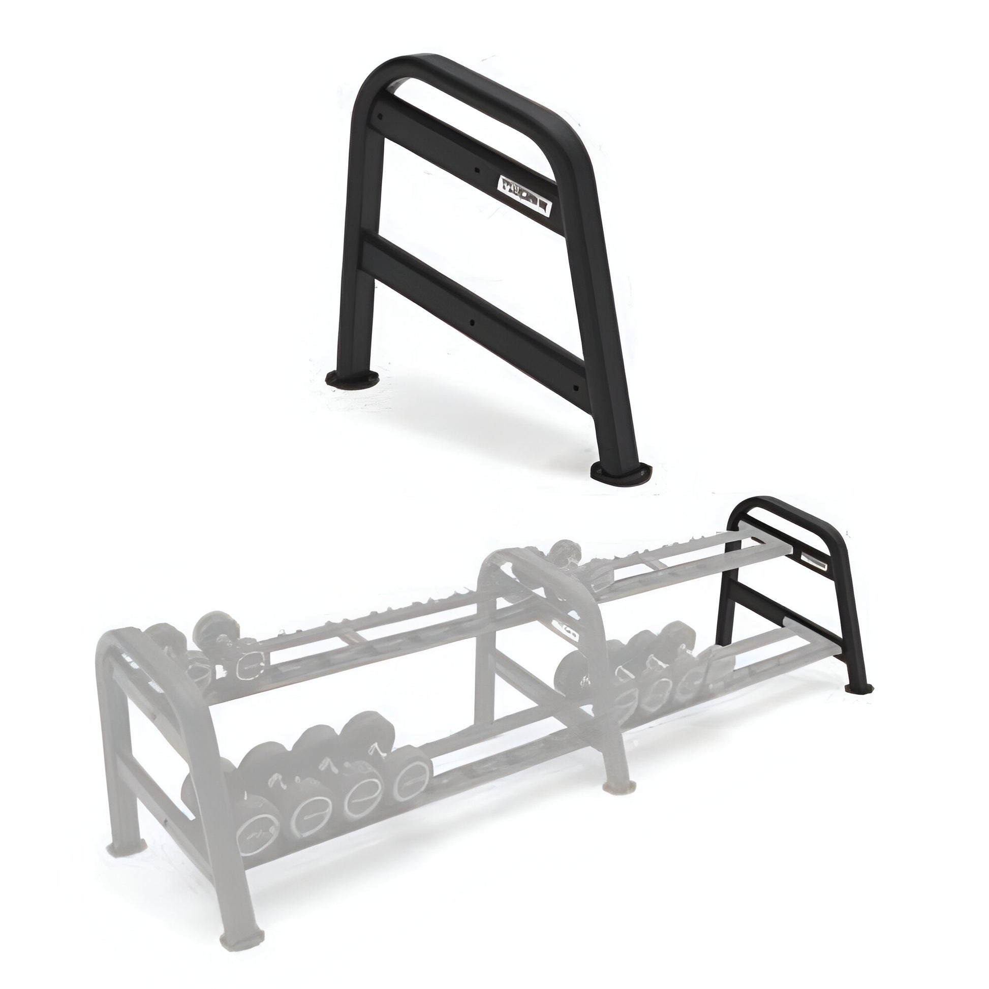 Telaio monolitico di supporto dei ripiani, elemento strutturale verticale progettato per ospitare 2 ripiani: assemblando telaio + vassoi in serie ad una rastrelliera RPMC-2 è possibile ottenere uno storage a più campate, che può ospitare sia manubri esagonali che a testa tonda.