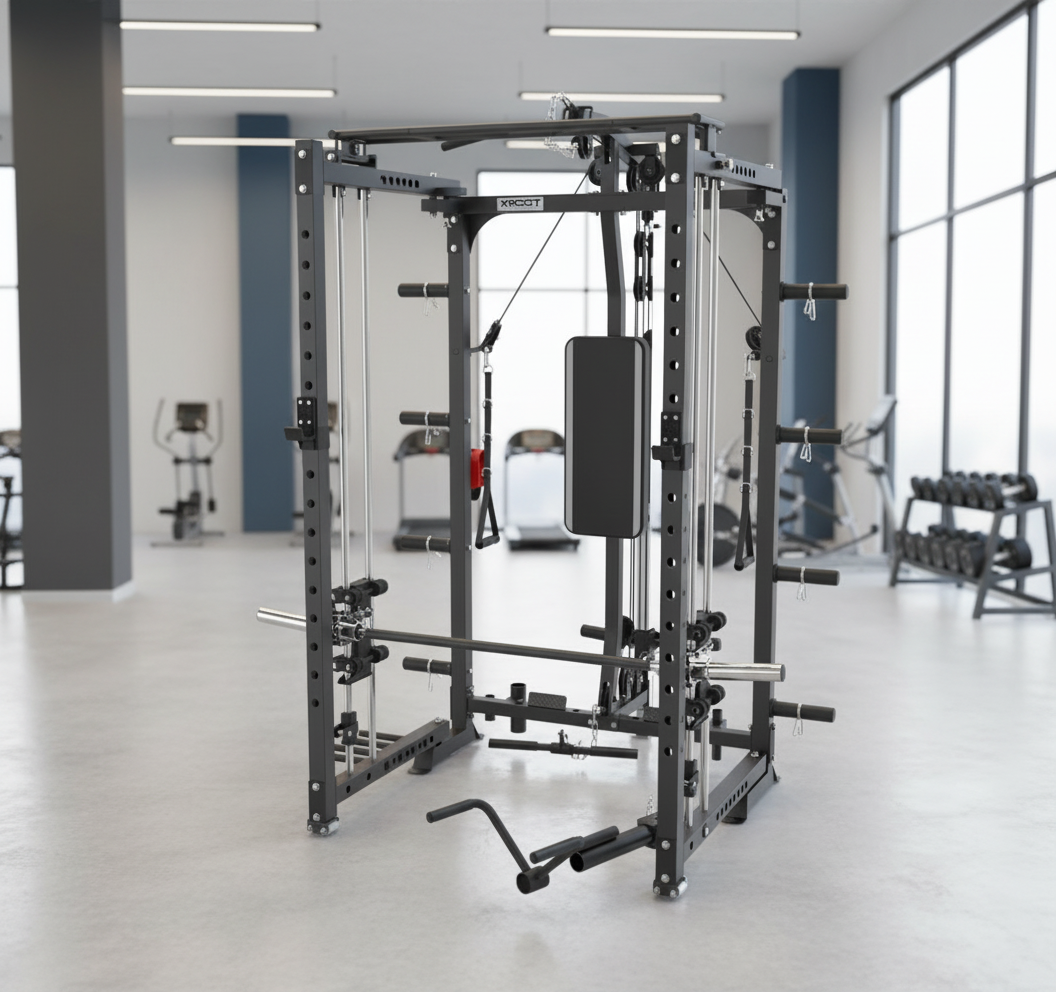 DOTAZIONI/NOTE: 4-IN-1 dual pulley&row, lat machine, smith machine, rack. Pieghevole salva-spazio. Manubri, 2 J-hook, porta bilanciere, barra trazioni multi presa, 4 ganci per fasce elastiche, 8 porta dischi ø50 mm e 25 mm, 12 ferma dischi a molla ø49 mm, 4 ferma dischi a mola ø47 mm. Attachments: cavigliera, corda,