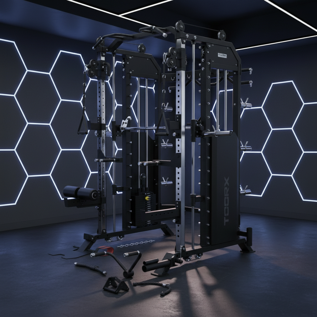 Dotazioni/note: 3-in-1 dual pulley, smith machine, rack. 2 j-hook, coppia fermi di sicurezza bilanciere, barra trazioni, parallele, porta bilanciere, 6 porta dischi ø50 mm, 8 ferma dischi a molla ø49 mm. Attachments: cavigliera, corda doppia tricipiti, catena, landmine, 2 maniglie trazioni, pedana antiscivolo, maniglia doppia, barra tricipiti, bilanciere e bilanciere curl