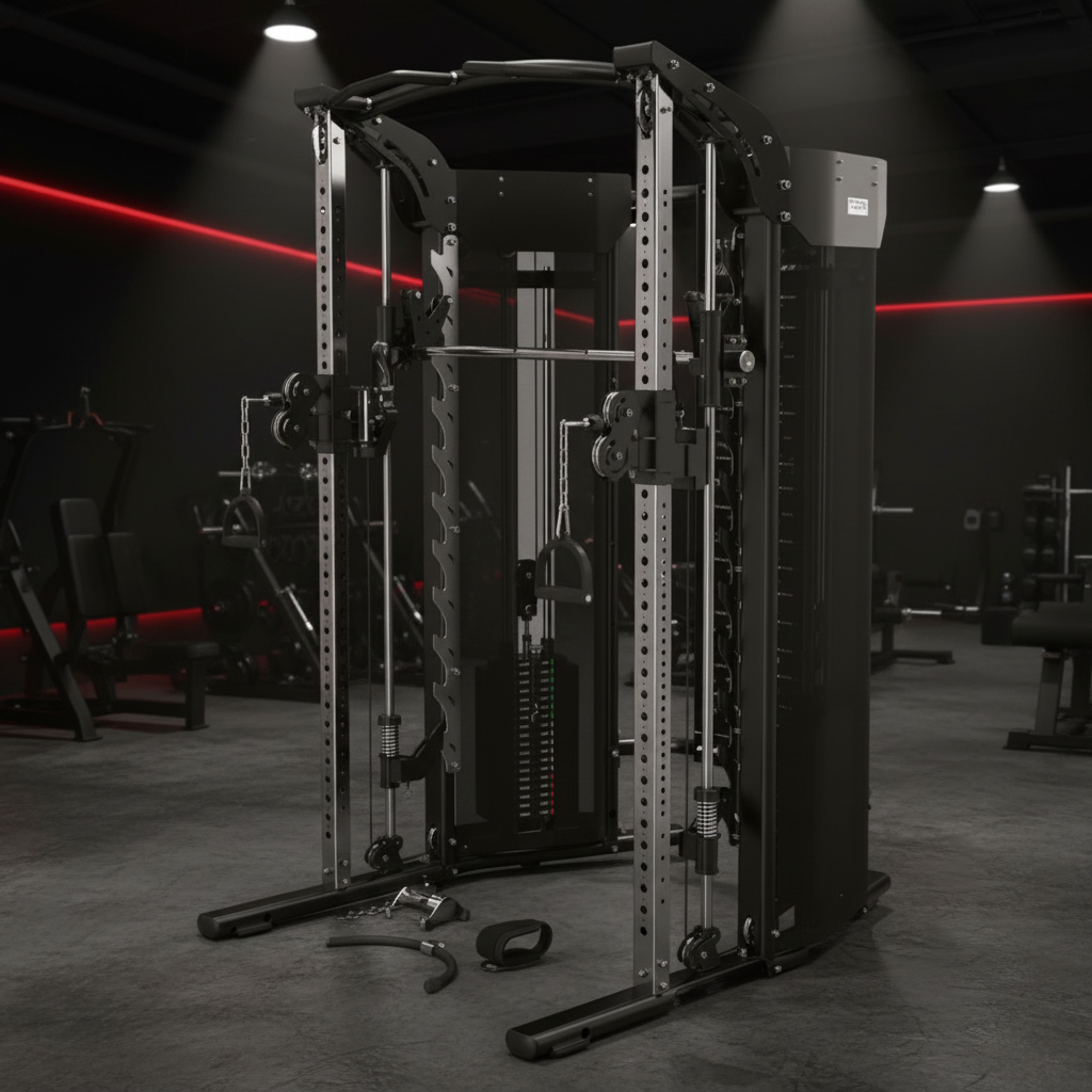 Caratteristiche: pacco pesi in acciaio 2×90 kg con carter di protezione; pulley regolabile 300–1875 mm con 50 livelli (interasse 25–50 mm); dotazione 3-in-1 dual pulley, smith machine, rack; barra trazioni; 8 ferma dischi a molla ø49 mm.