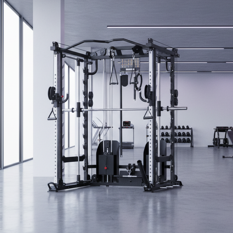 Dotazioni: sistema 2-in-1 con dual pulley e 3D Smith Machine, stazione Lat pulldown, seated rowing e barra trazioni (chin-up bar)