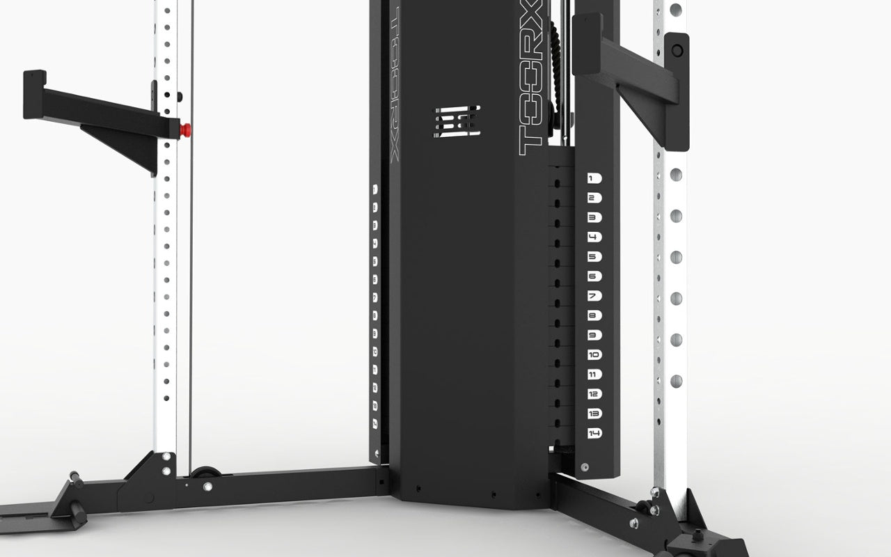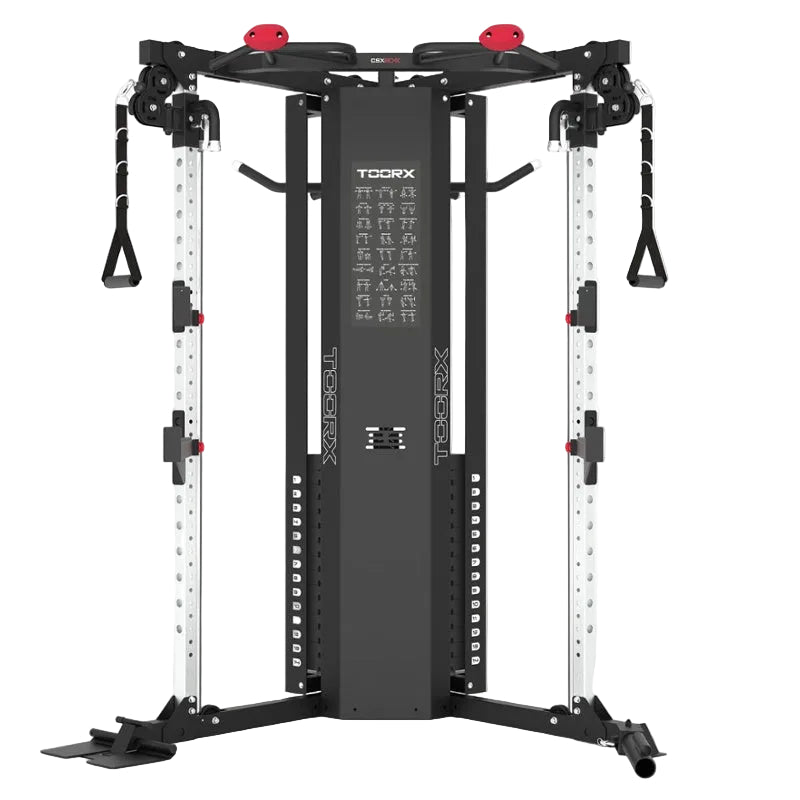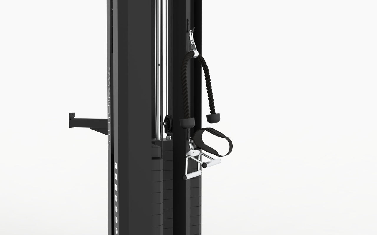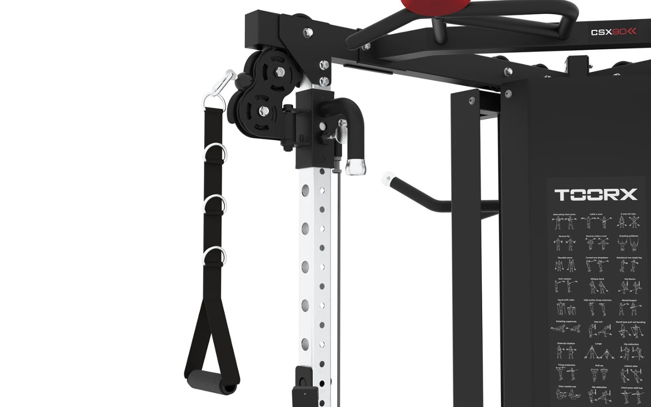 Dotazioni incluse: Landmine, fermi di sicurezza, J-hook, maniglia trazioni, cavigliera, barra bicipiti, corda doppia per tricipiti, impugnatura regolabile, Lat Bar