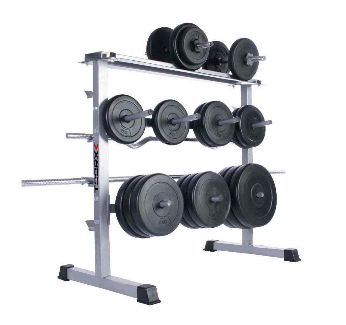 La rastrelliera permette di riporre comodamente fino a 3 coppie di manubri nel piano rialzato. Si possono riporre i dischi di tutte le taglie (da 1 kg fino a 20kg) in quanto i portadischi sono studiati alla giusta distanza tra loro per riporre dischi di tutti i diametri.