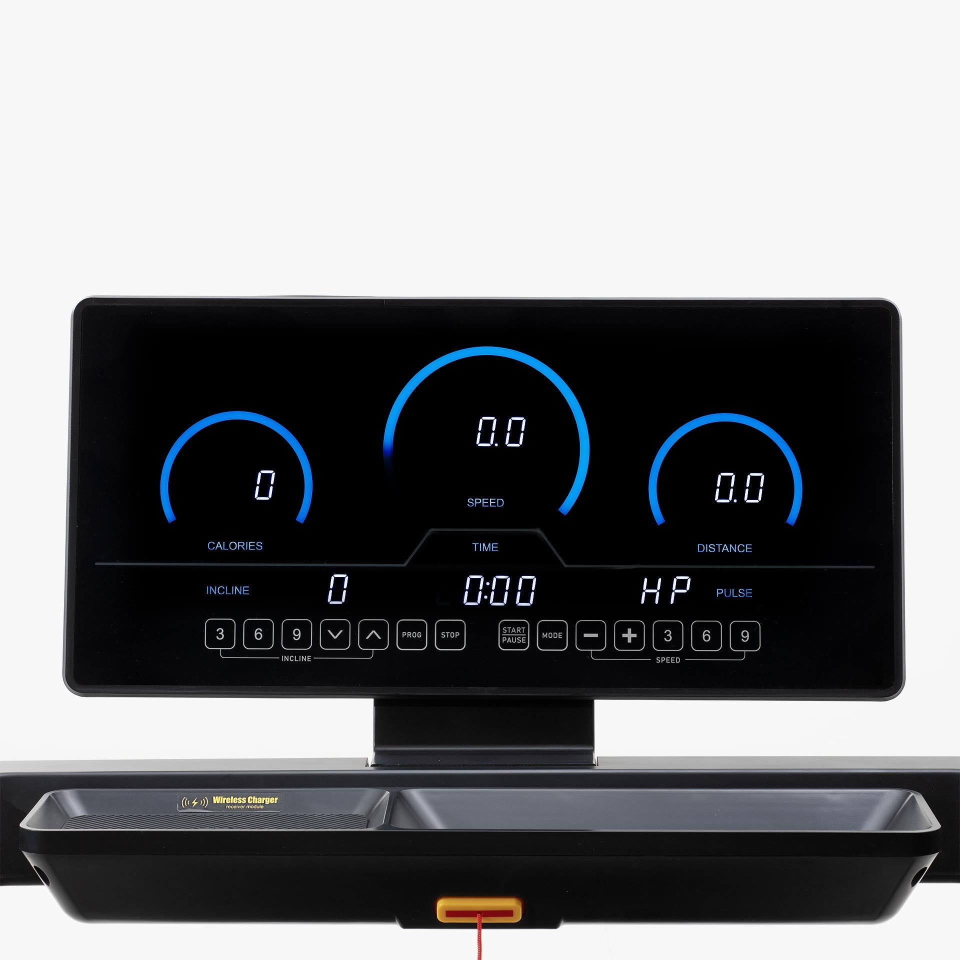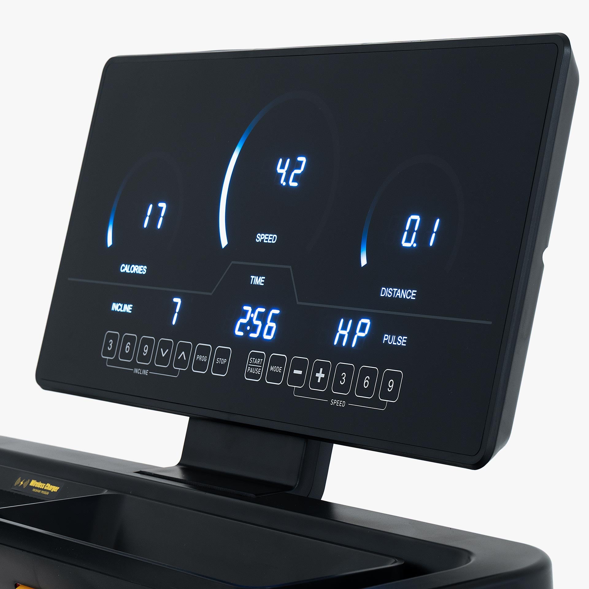 Informazioni console principale: tempo, distanza, velocità, inclinazione, frequenza cardiaca, calorie