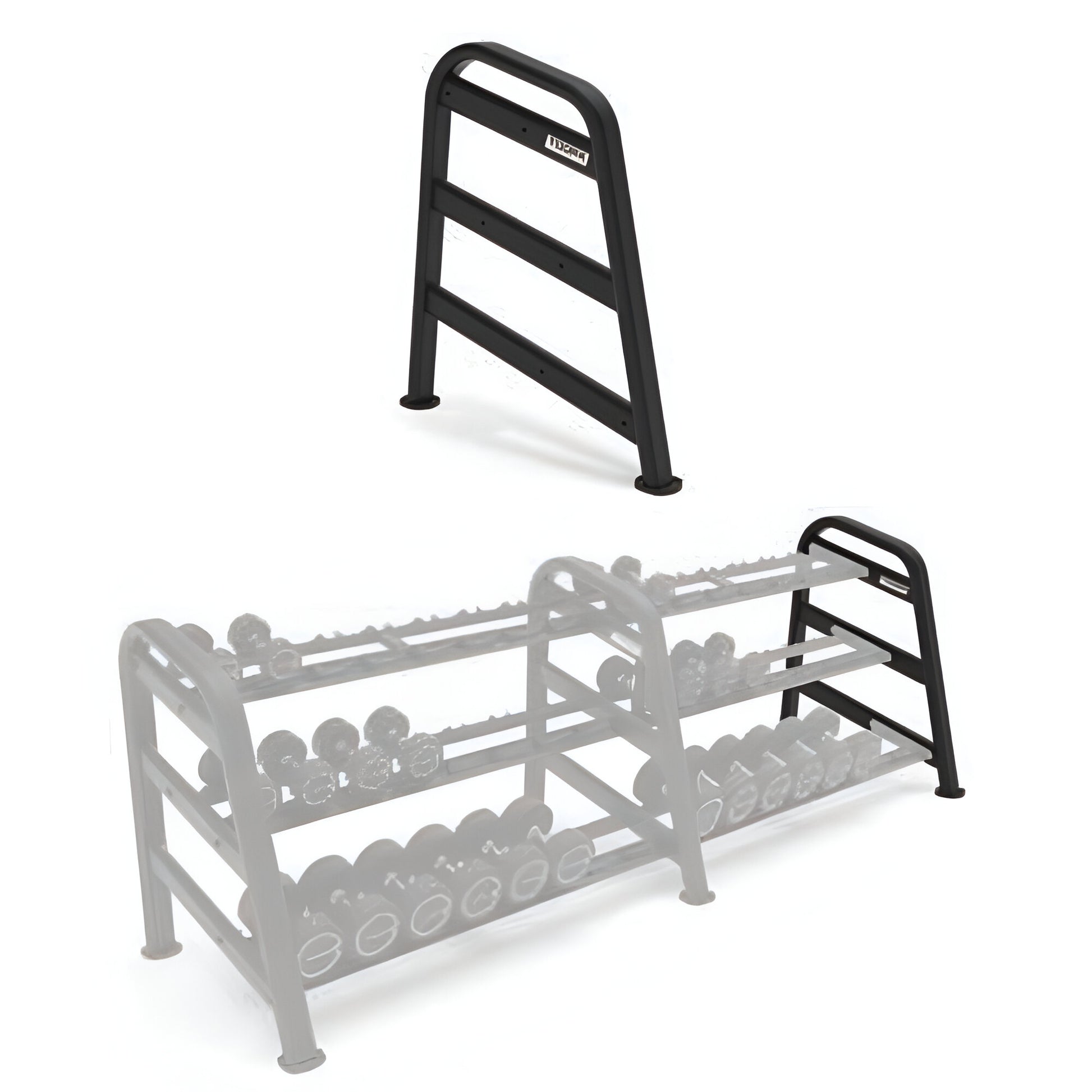 Telaio monolitico di supporto dei ripiani, elemento strutturale verticale progettato per ospitare 3 ripiani: assemblando telaio + vassoi in serie ad una rastrelliera RPMC-3 è possibile ottenere uno storage a più campate, che può ospitare sia manubri esagonali che a testa tonda.