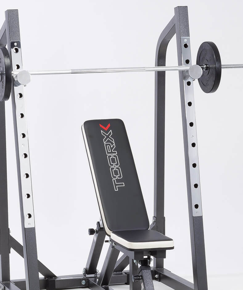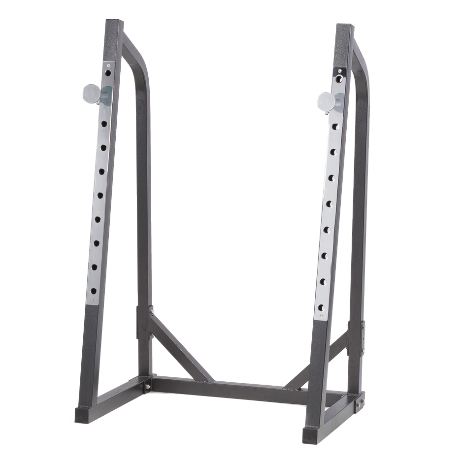 Altezza supporti bilanciere: regolabile 620/1500 mm su 10 livelli tramite fermi in acciaio pieno cromato con dispositivi di sicurezza Distanza supporti bilanciere: 890 mm. Adatto a bilancieri di lunghezza 120 cm o superiore |